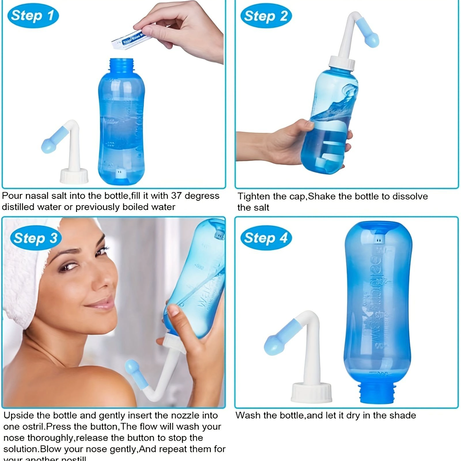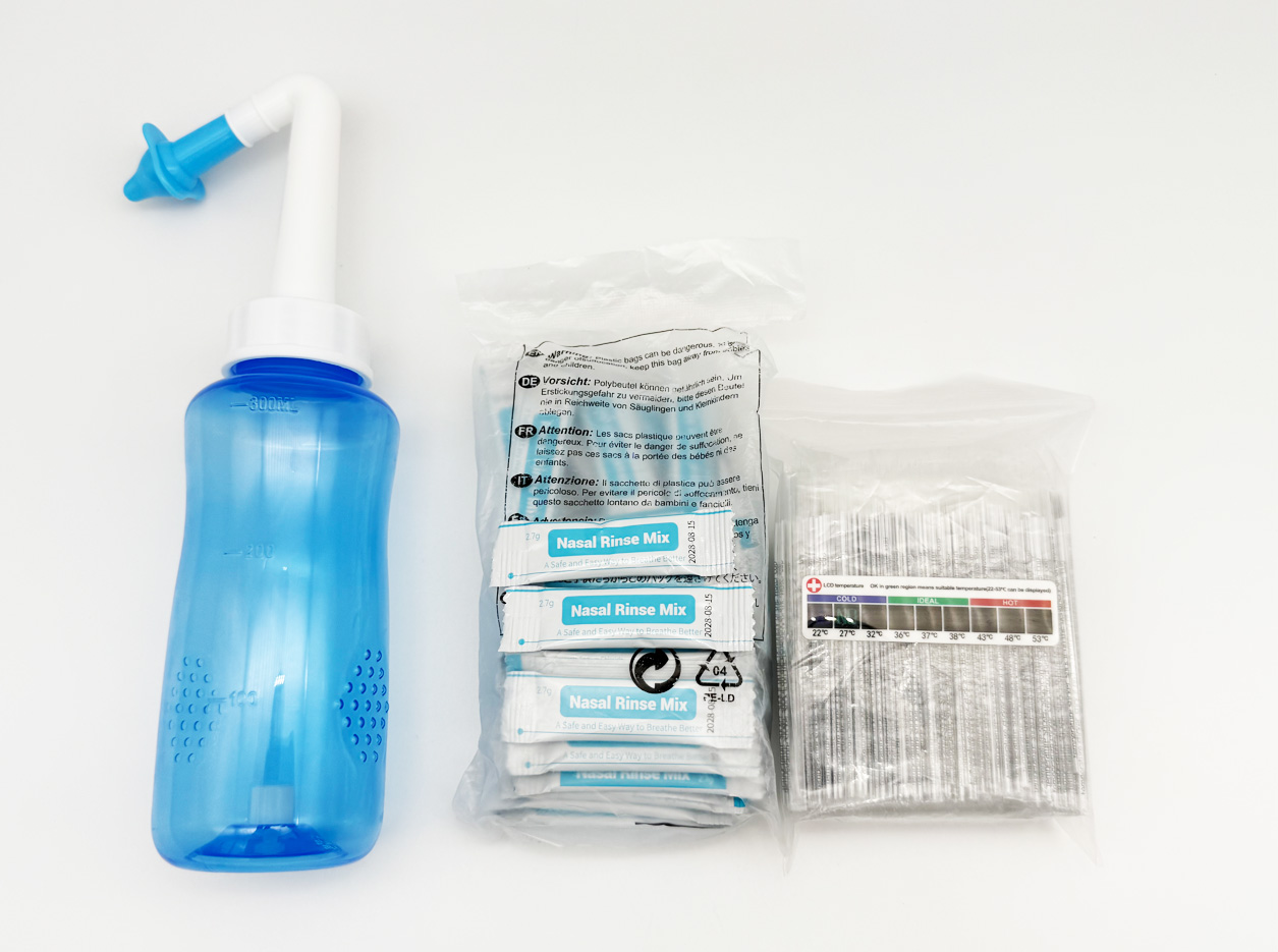 Le flacon de rinçage nasal de 300 ml nécessite 2,7g de sel de rinçage nasal à utiliser. (Ce lien n'inclut pas sel de rinçage nasal et pâte de température LCD; peut être acheté via d’autres liens sur notre site Web.)